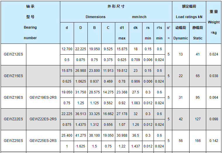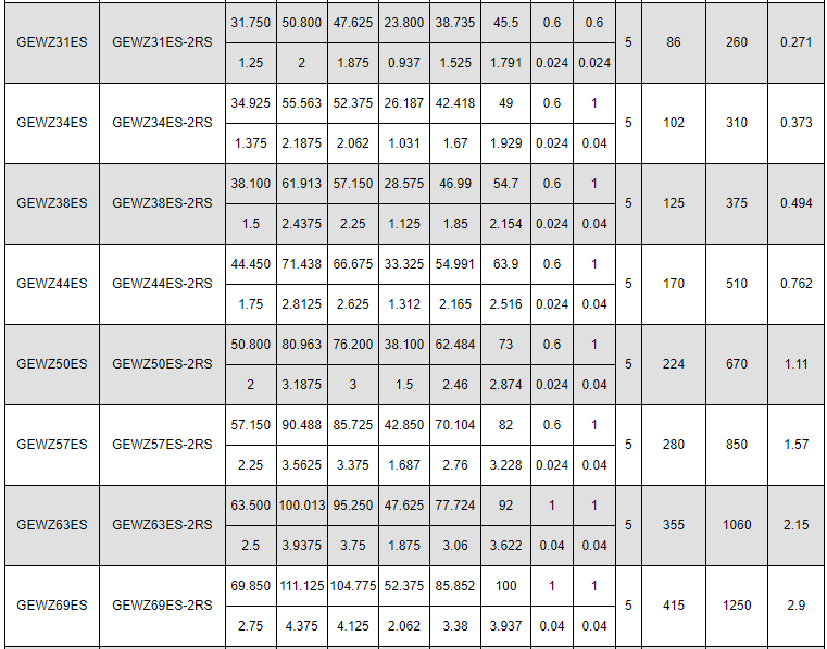 GEWZ...ES-2RS 产品特点与GEEM…ES-2RS系列相同,但为英制尺寸。