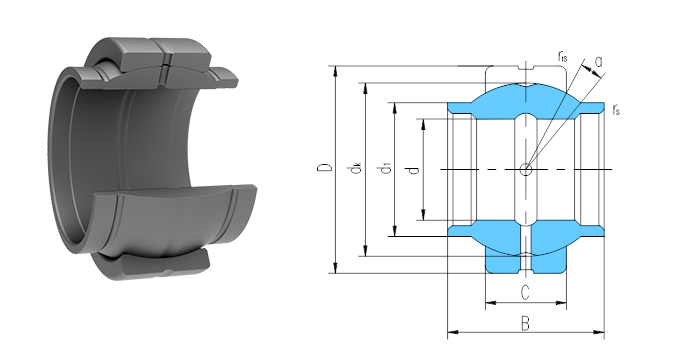 产品特点:内圈两端带伸出圆筒,外圈有一道轴向缝,内、外圈材料均为轴承钢,淬火,磷化,滑动表面涂敷二硫化钼。
