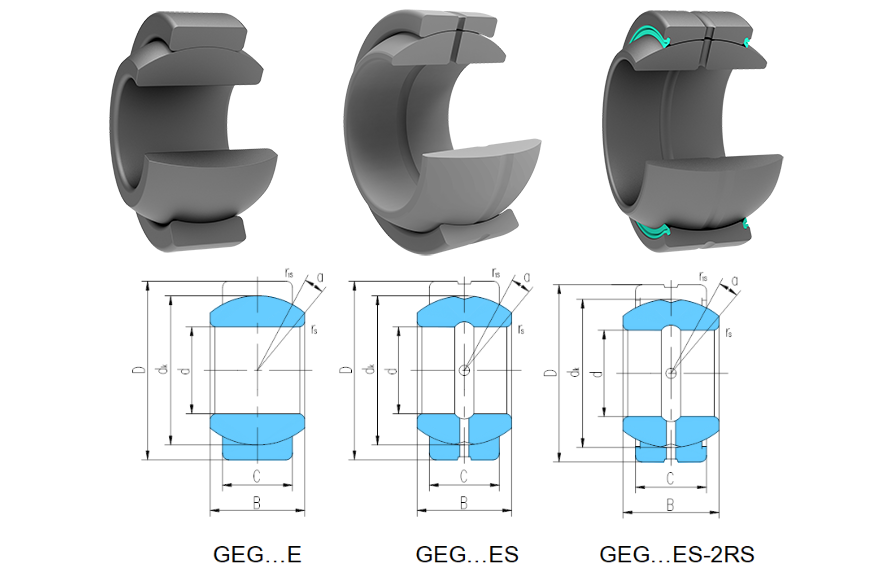 产品特点:外圈有一道轴向缝,内、外圈材料均为轴承钢,淬火,磷化,滑动表面涂敷二硫化钼。除型号后置代号为E外,其余型号内、外圈均有润滑油槽油孔,后置代号有-2RS为外圈两端带有密封圈。