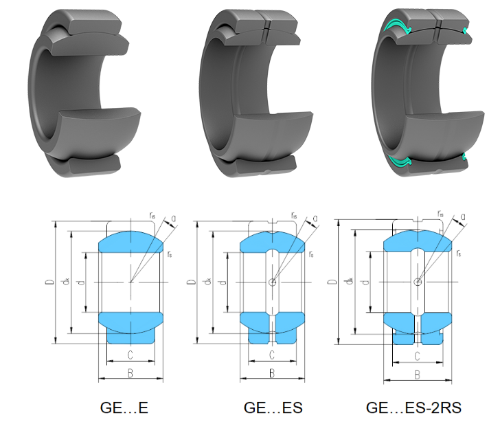 产品特点:外圈有一道轴向缝,内、外圈材料均为轴承钢,淬火,磷化,滑动表面涂敷二硫化钼。除型号后置代号为E外,其余型号内、外圈均有润滑油槽油孔,后置代号有-2RS为外圈两端带有密封圈。